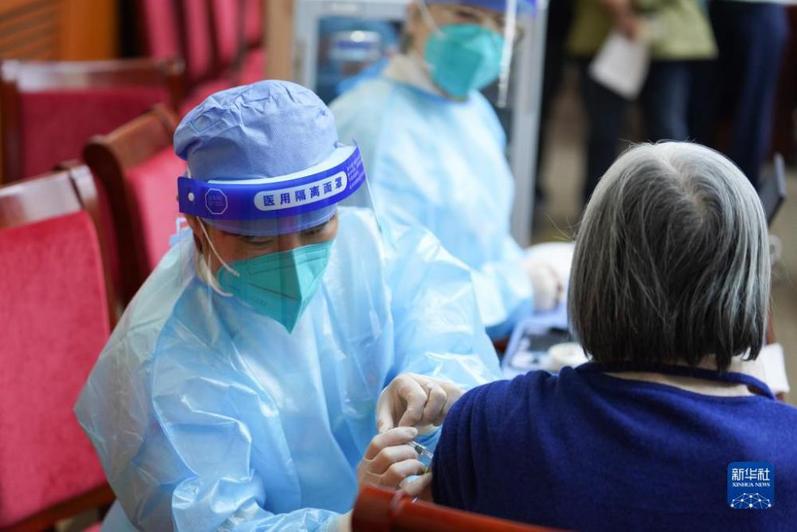 4月18日,医护人员在北京市东城区为老年人接种新冠疫苗。