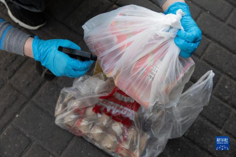 4月17日,在上海黄浦区豫园街道广福居民区,广福居委会工作人员对分装好的物资进行消毒处理。新华社记者 金立旺 摄