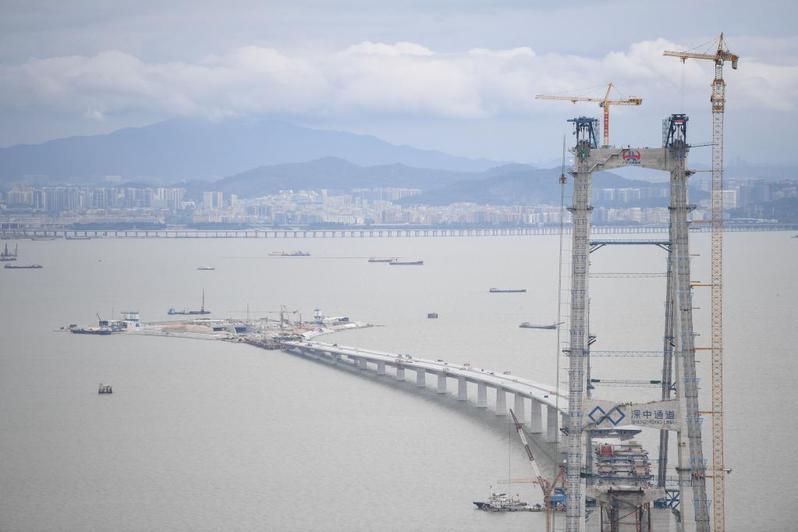 这是2022年6月7日拍摄的深中通道伶仃洋大桥东塔、西人工岛及远处的深圳市区。新华社记者邓华 摄