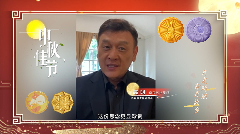 活动中,各高校众多海外学子纷纷发来中秋深情寄语视频。南艺音乐学院76届小提琴专业杰出校友、美国拿波里斯爱乐乐团(Naples Philharmonic)副首席、佛罗里达爱乐乐团The Florida Philharmonic)首席、纽约夏季音乐节Chautauqua交响乐团第一小提琴、佛罗里达海湾海岸大学(FGCU)兼职教授高明先生代表全球南艺人,为母校送上最深情、最温暖的祝福,祝福中满是对母校深深的思念。他表示南艺的校徽是牵系着他与母校的纽带,虽然人在海外,但校徽所承载的艺术精神与母校情怀永驻心间,最后祝愿母校人才辈出,再谱新篇!