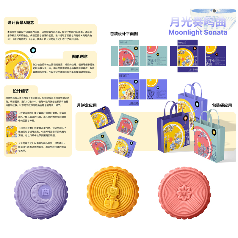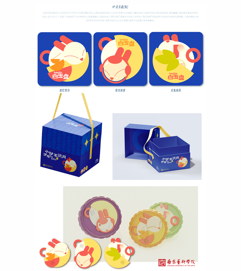 南艺欧美同学会(南艺留学人员联谊会)理事、设计学院青年教师张福也指导设计学院视觉传达专业的研究生胡瑞桐、本科生李昊阳、陈心钰、蒋亚彤、陈嘉琪五位同学为活动精心设计月饼及包装作品,每一处细节都充满了匠心与巧思,让人耳目一新。这份“中秋的礼赞”,巧妙地融合了传统中式纹样的创新再设计、极简而风趣的“月兔”图形,以及诗歌唱片的实验性探索和图形化字体的精妙转译,既彰显了南京这座古都的深厚文化底蕴,又展现了南艺师生精湛的专业技能与开放多元的创新思维,生动诠释了文明交流互鉴的理念,传递了浓厚的乡情温度,向世界展示了南京的文化自信与青春活力,充分彰显了南艺师生服务海内外文化交流、融通中外的使命担当。