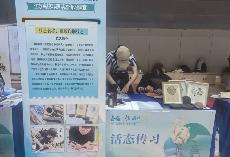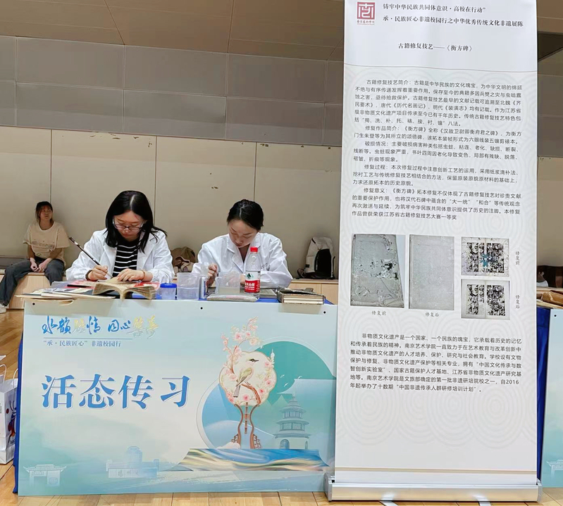 展览现场,除了现场展呈作品外,我校师生还进行了古籍修复技艺、雕版印刷技艺活态展示。现场观展师生参与雕版印刷、古籍修复,深刻体会到传统工艺的精妙与匠心精神的传承价值,激发了对中华优秀传统文化的浓厚兴趣与情感认同。参与此次活动,为进一步增强师生的文化自信与民族自豪感,进一步铸牢中华民族共同体意识做出了积极探索与南艺贡献。