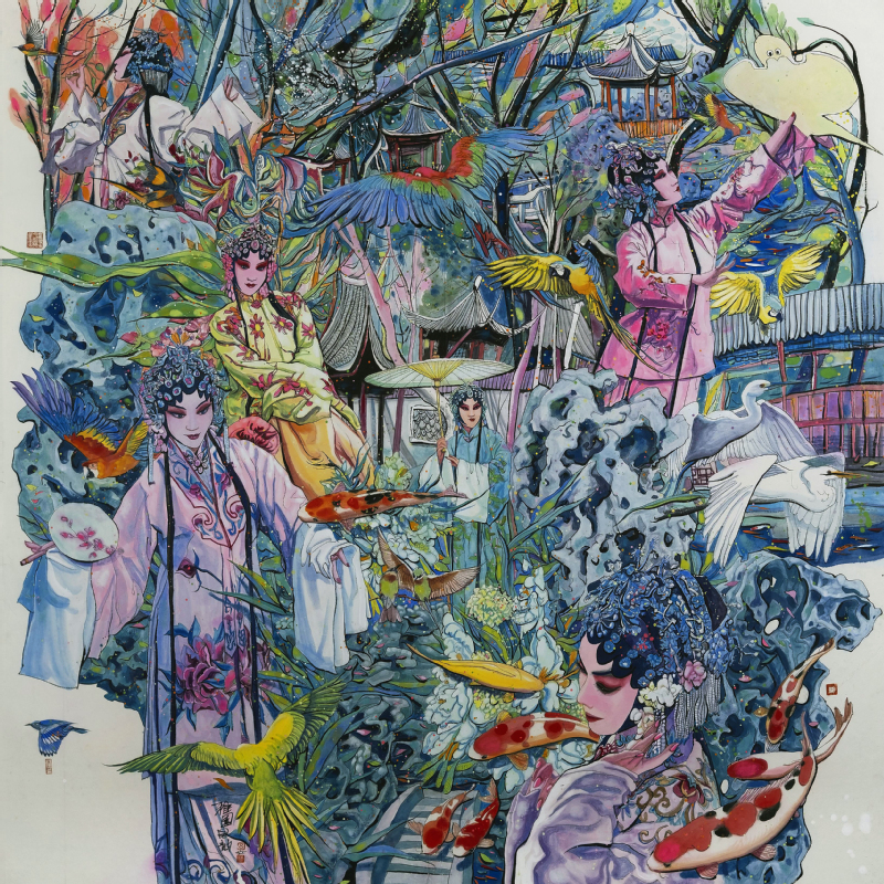 作品简介:用传统彩墨和现代构成描绘出国家级非物质文化遗产昆曲的表演现场。